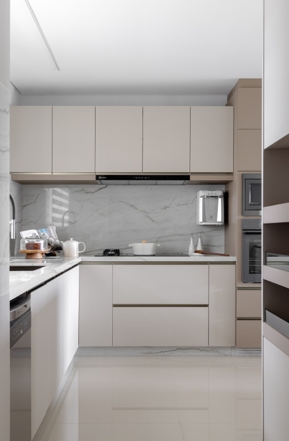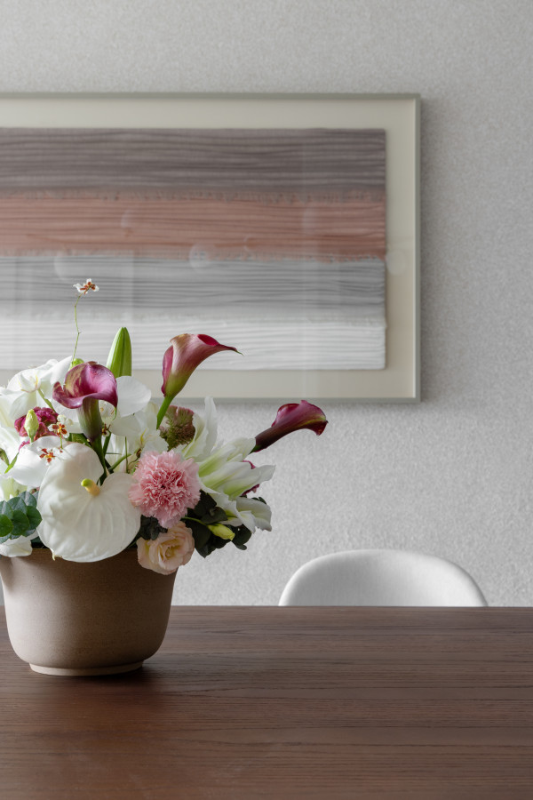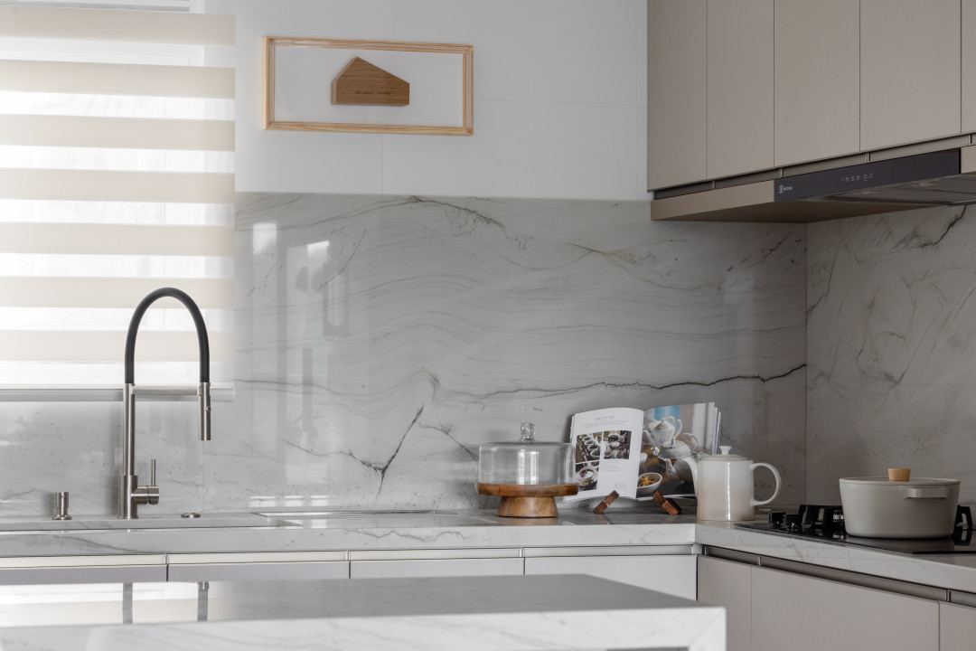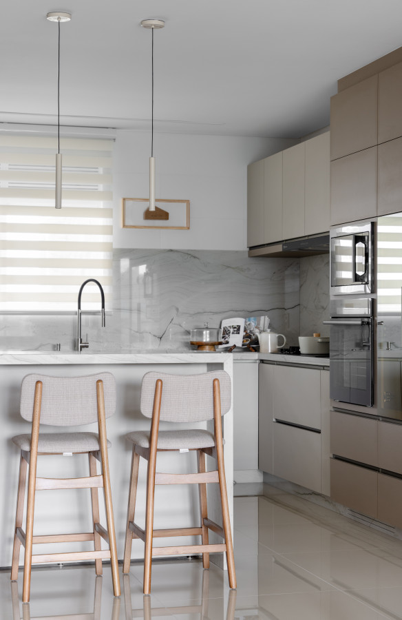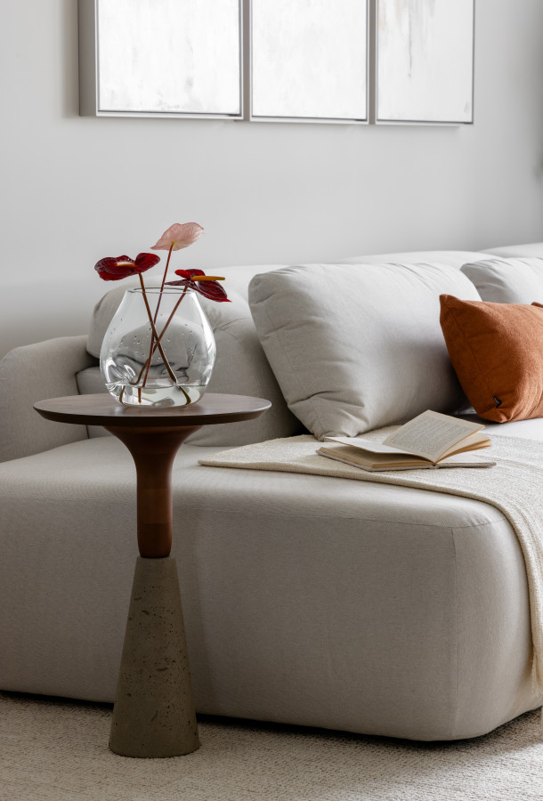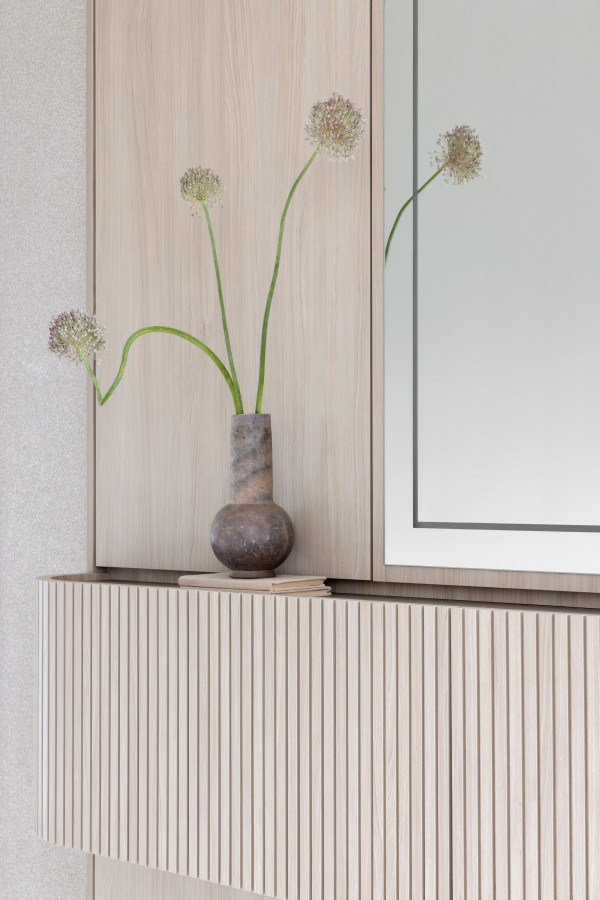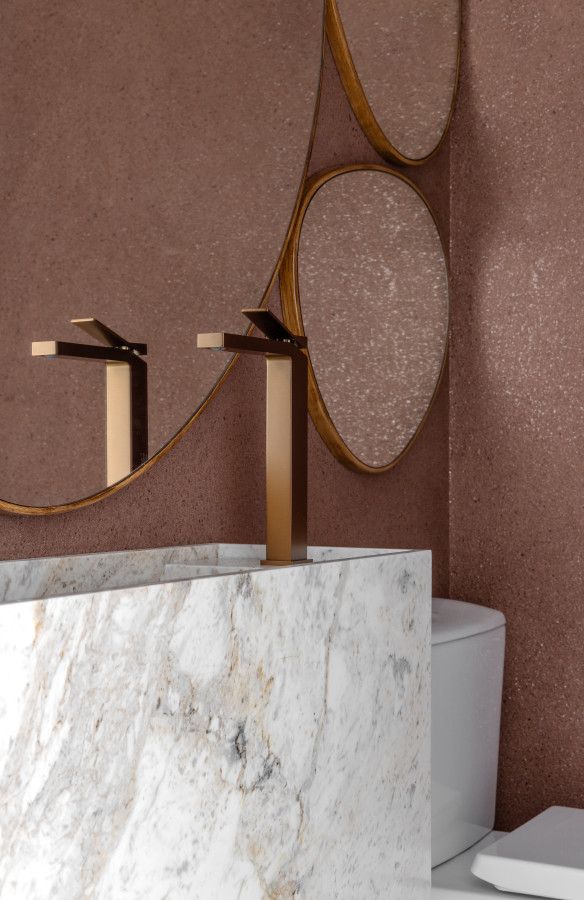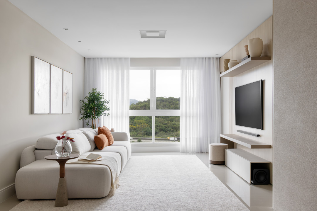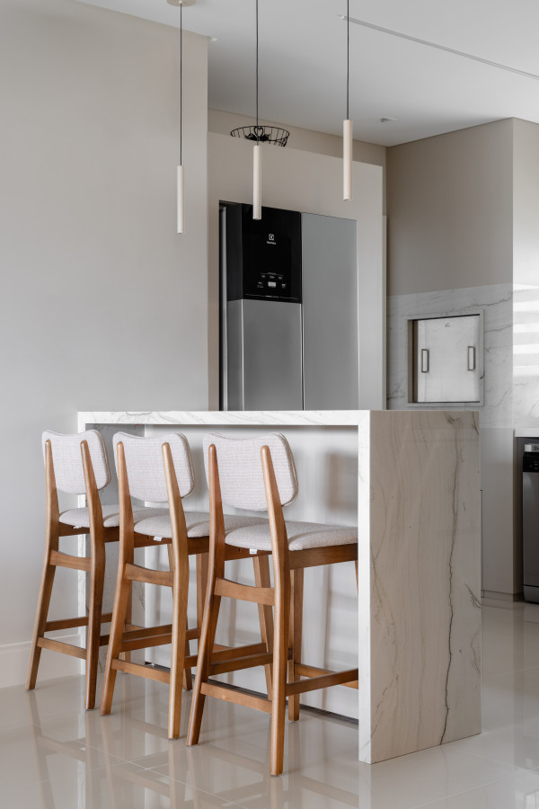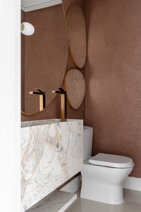 O apartamento conta com um living linear integrado, composto por sala de estar, sala de jantar e cozinha. De um lado, vista para a vegetação permanente, e de outro, vista direta para o mar, paisagens que emolduraram nosso projeto. O living foi pensado para acolher toda a família e tornar as atividades do dia-a-dia mais funcionais e prazerosas. Os tons neutros abrem espaço para o contraste das texturas: pedras, madeira e tecidos naturais - uma composição sofisticada, mas que acolhe o olhar. Já o lavabo trouxe presença de cor, na textura das paredes, na pedra e nos metais.